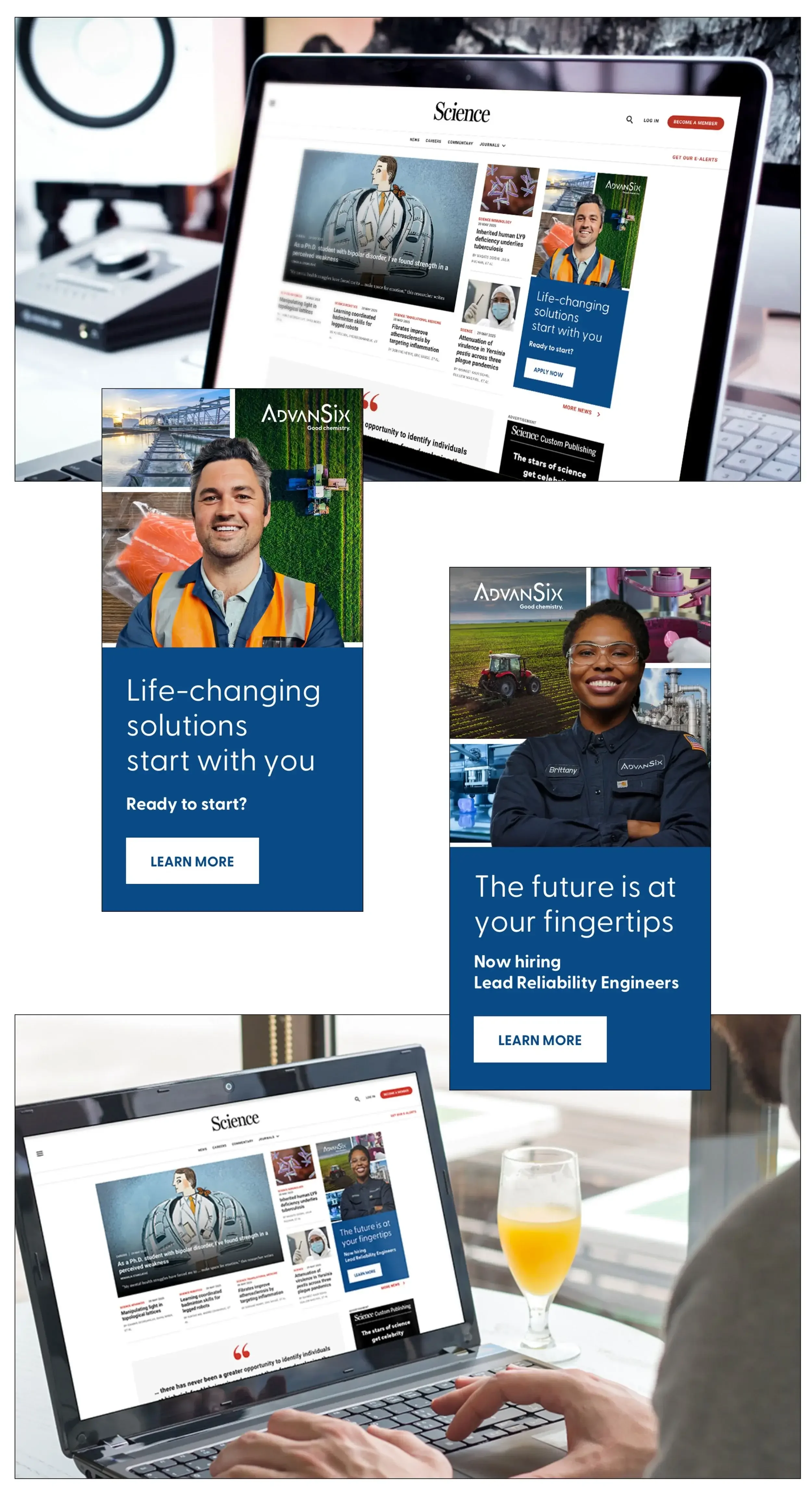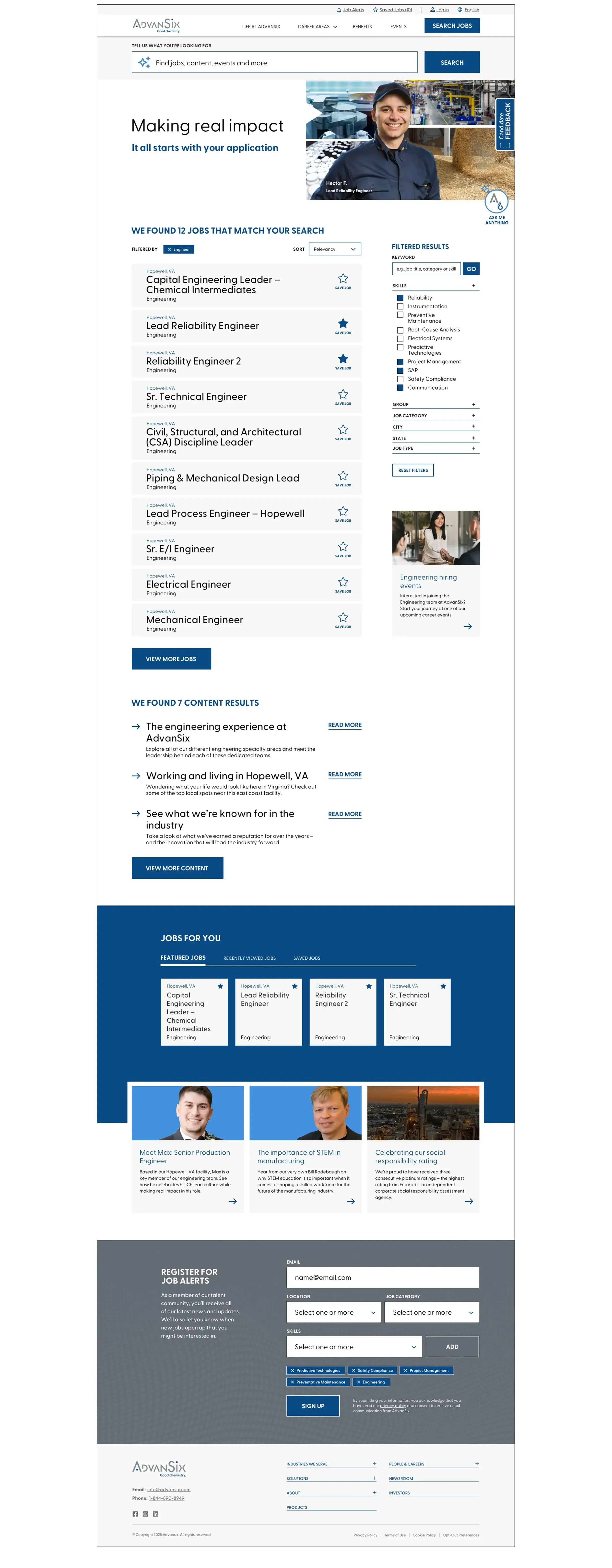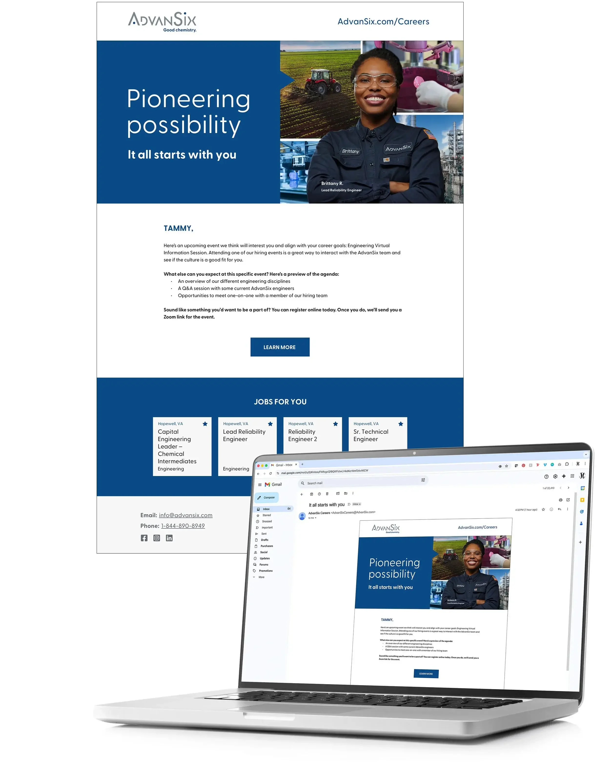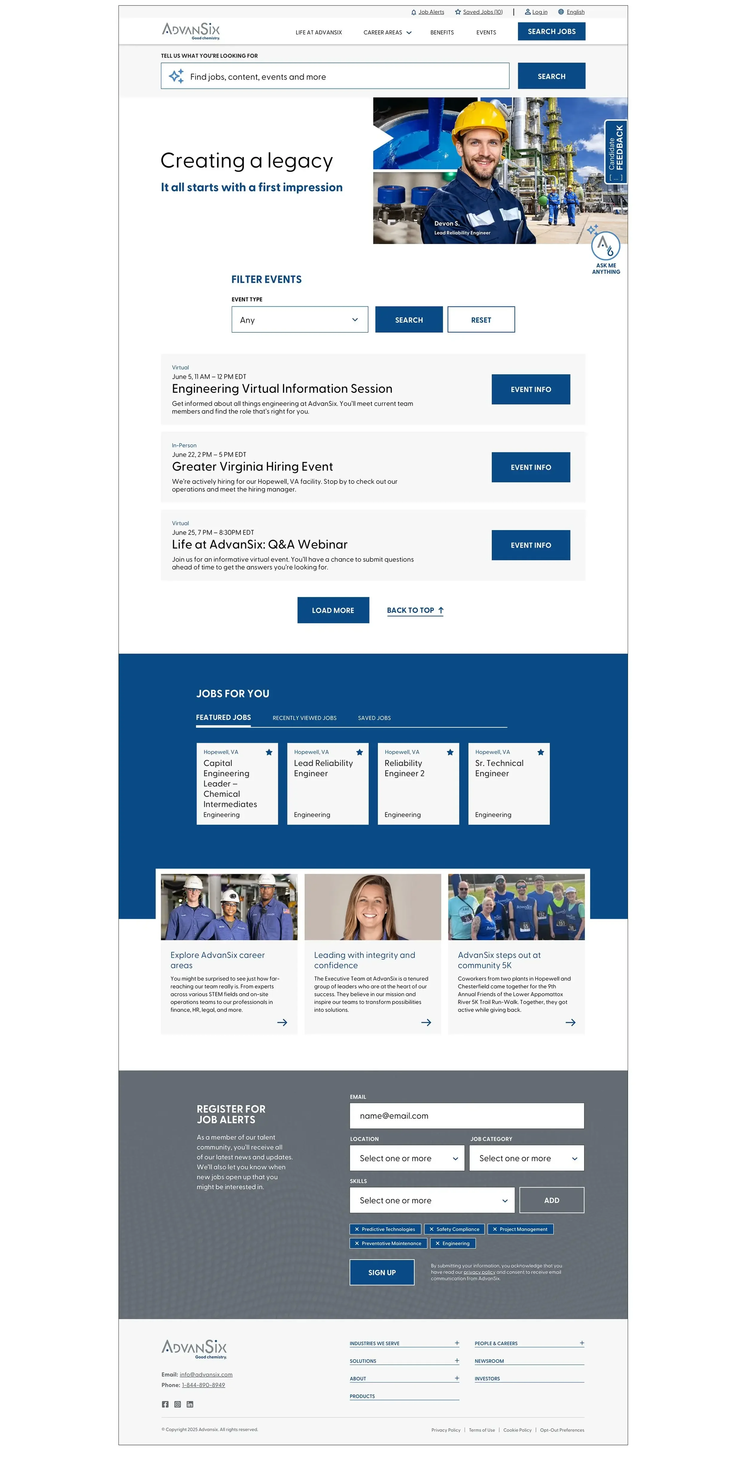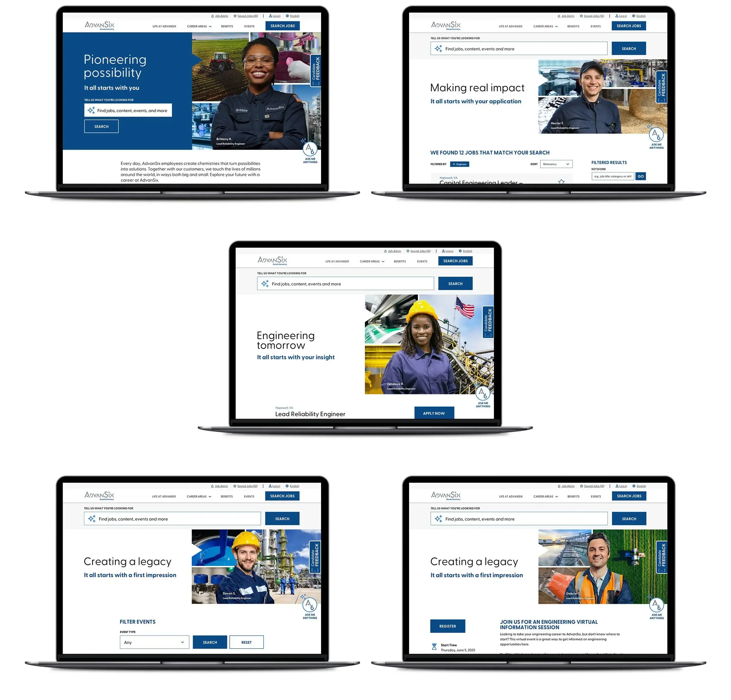 I led creative direction in partnership with art and copy to develop “It All Starts With You,” a candidate-centered employer brand concept that connected individual impact to the breadth of industries AdvanSix supports. Additional mockups showcased how AI-driven personalization could tailor content and career pathways based on visitor needs, while remaining scalable and consistent across roles and audiences.