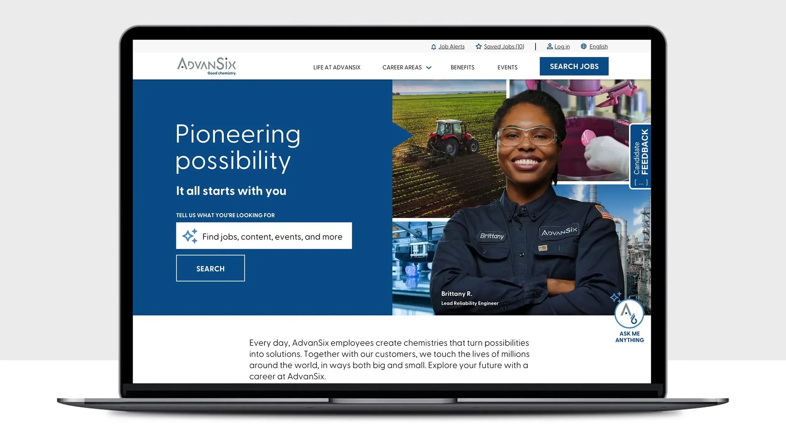 AdvanSix was evaluating creative services and a new career site platform as part of a business pitch. The work needed to introduce a distinct employer brand idea while clearly demonstrating the AI-enabled capabilities of the proposed career site experience.