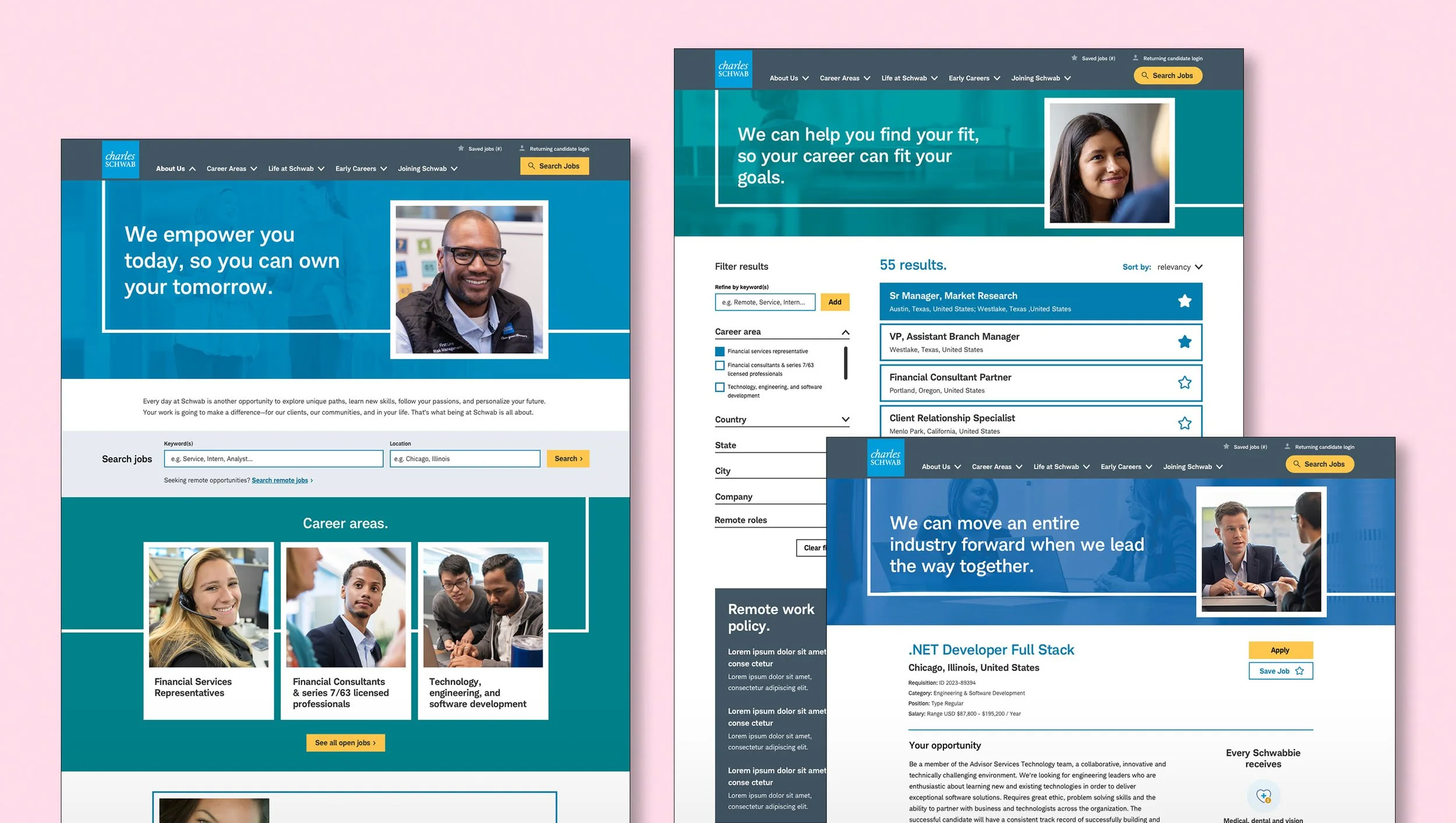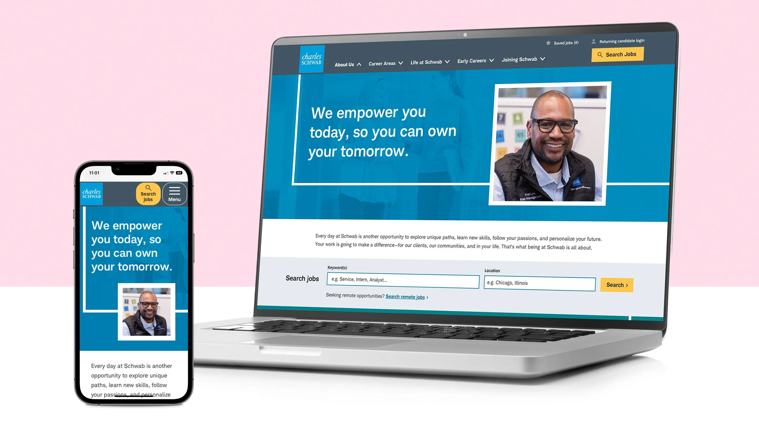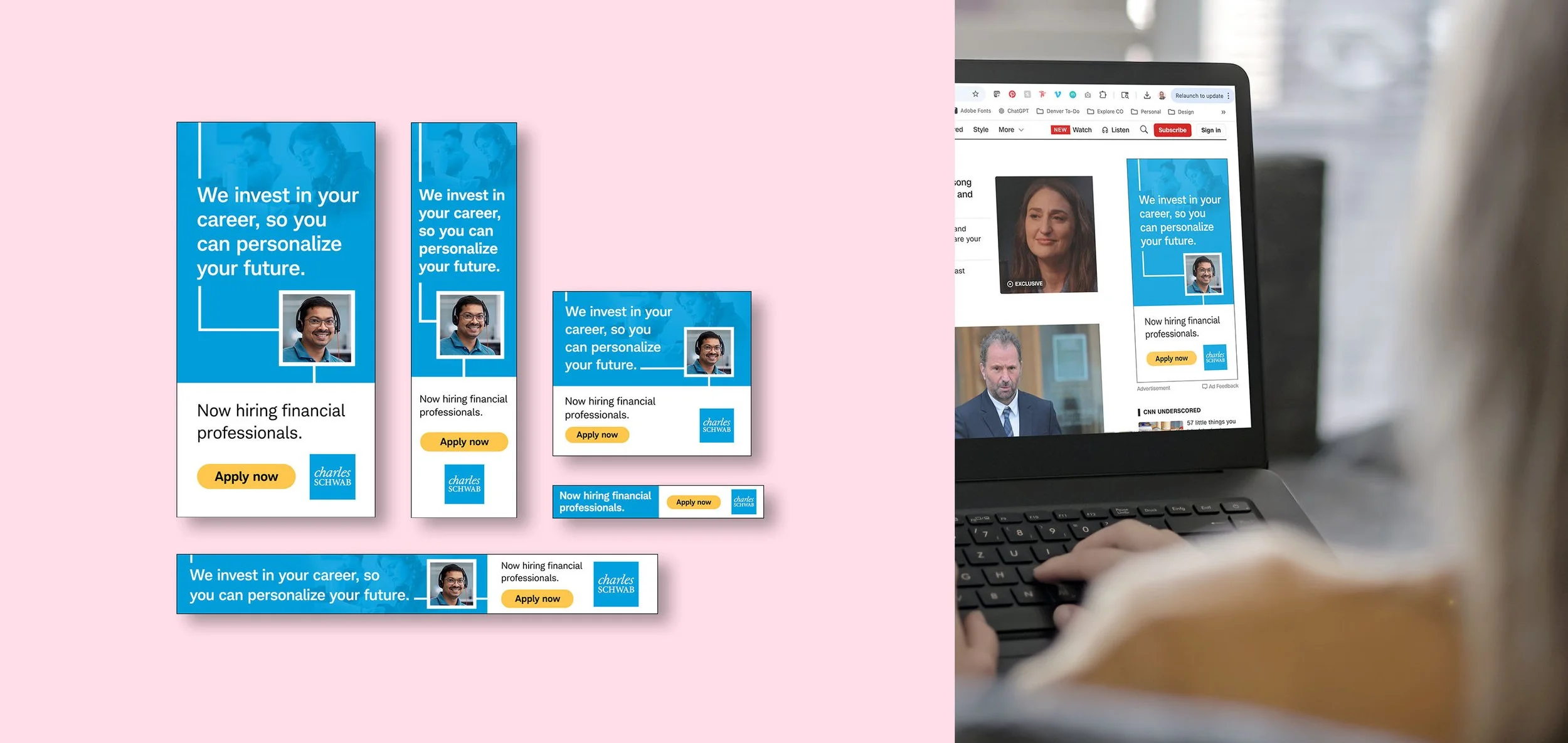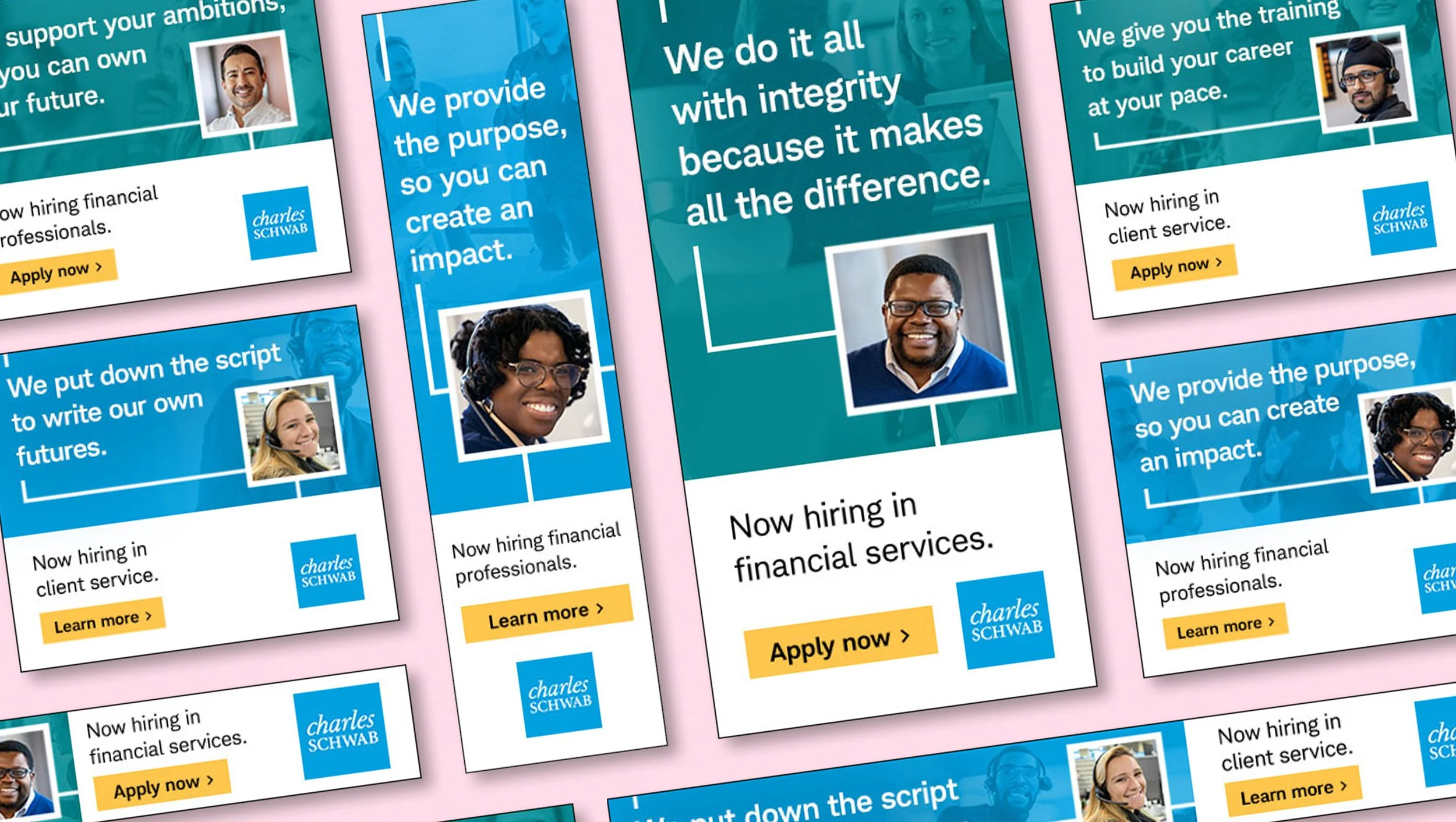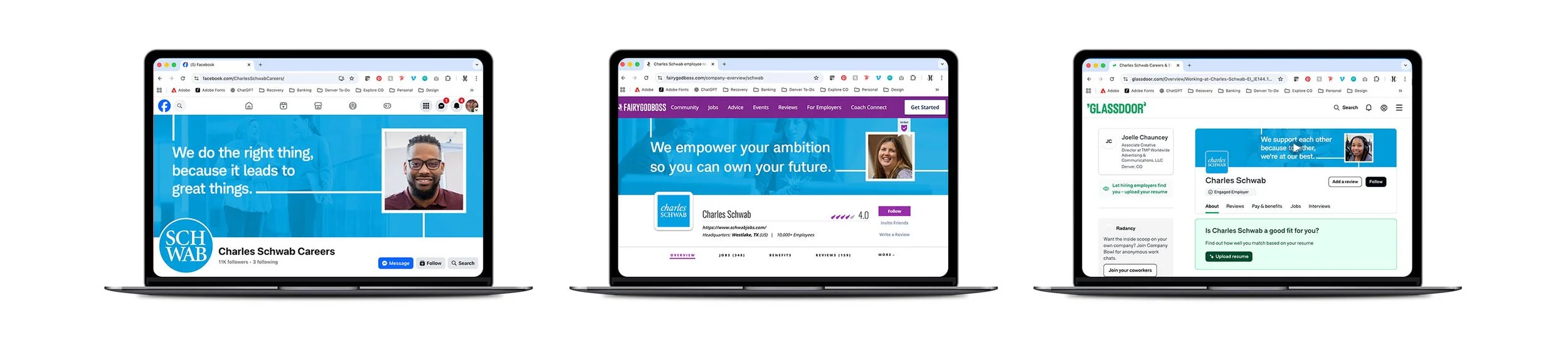 Charles Schwab needed an employer brand platform that could support hiring across a nationwide footprint and a wide range of roles. “We Are Schwab” positions employees as part of a collective effort to help clients move forward. The system was built to unify messaging and scale across campaign, career site, and recruitment marketing.